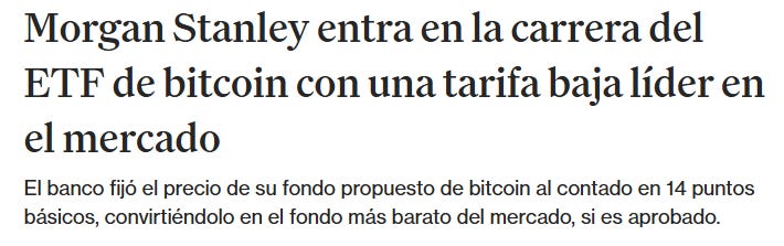 Para pensar: Hace tres años, Morgan Stanley restringía activamente a sus asesores de recomendar Bitcoin a sus clientes. Hoy lanza su propio ETF de Bitcoin con la comisión más baja del mercado. ¿Crees que los otros bancos se sentarán a seguir viendo desde la orilla?