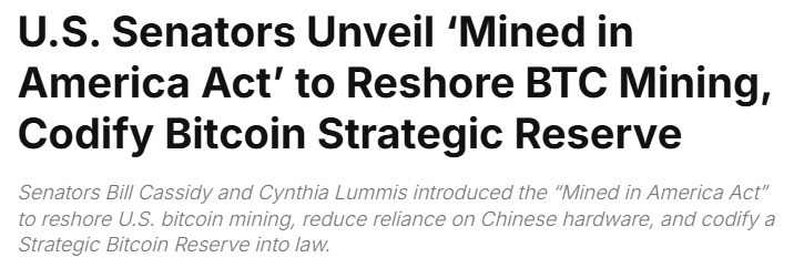 Qué pasó: El 30 de marzo, los senadores Cynthia Lummis y Bill Cassidy introdujeron el “Mined in America Act” — una propuesta de ley que, entre otras cosas, busca codificar la Reserva Estratégica de Bitcoin de Estados Unidos directamente en la legislación federal. Hasta ahora, la reserva existe por orden ejecutiva del presidente Trump en Marzo de 2025, lo que significa que puede ser revertida o modificada por cualquier administración futura sin necesidad de aprobación del Congreso. Aquí viene el dato importante: si esta acta se convierte en ley, eso cambia: la reserva quedaría protegida por el proceso legislativo, haciéndola significativamente más difícil de desmantelar. El proyecto también incluye medidas para fortalecer la infraestructura de minería de Bitcoin dentro del país y reducir la dependencia de hardware extranjero — detalles que reflejan la creciente visión de Bitcoin como un activo estratégico nacional.