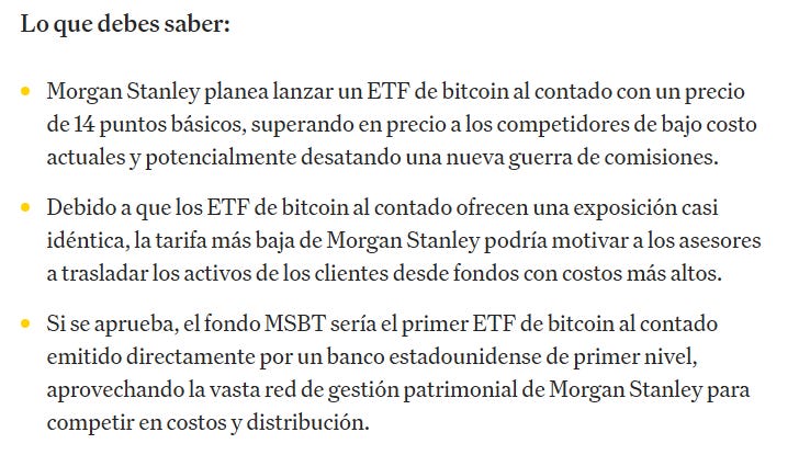 Qué pasó: El 27 de marzo, Morgan Stanley presentó ante los reguladores la versión final de su solicitud para lanzar su propio ETF de Bitcoin al contado bajo el símbolo MSBT, con una comisión anual de 0.14% — que por cierto, sería la más baja de todo el mercado. Para dar contexto: BlackRock, el mayor gestor de activos del mundo, que hoy cuenta con el ETF de Bitcoin más exitoso del mundo (IBIT) cobra 0.25% por su ETF de Bitcoin. Esto quiere decir que el nuevo ETF de Morgan Stanley será, de ser aprobado, 0.11% más barato, un número que no es pequeño cuando se habla de comisiones.