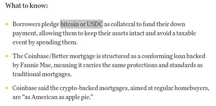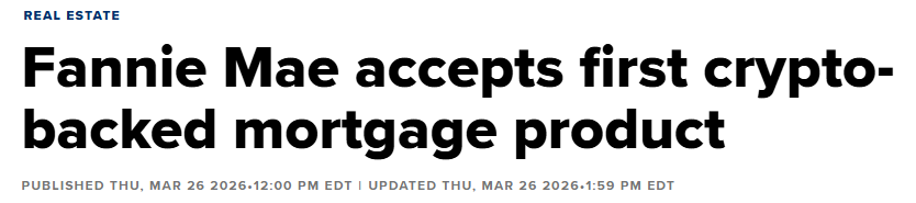 Qué pasó: El 26 de marzo, Better Home and Finance (una de las principales hipotecarias digitales de Estados Unidos) y Coinbase lanzaron el primer producto hipotecario conforme a los requisitos de Fannie Mae respaldado por criptomonedas. Fannie Mae es la institución gubernamental que compra y garantiza la mayoría de las hipotecas del país — que un producto sea “conforme” significa que cumple sus estándares y puede circular dentro del sistema financiero convencional.